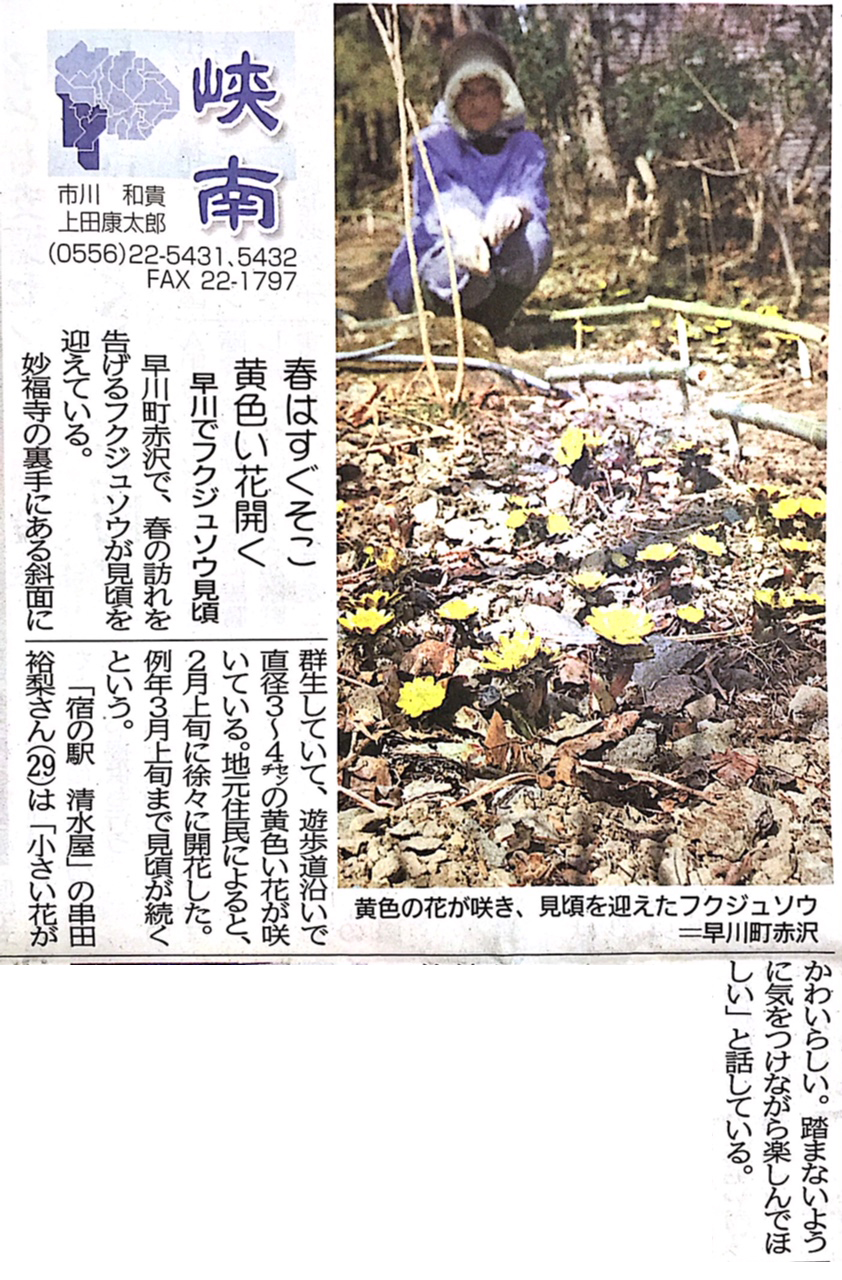 早川町赤沢宿の福寿草が、本日の山梨日日新聞に紹介されました