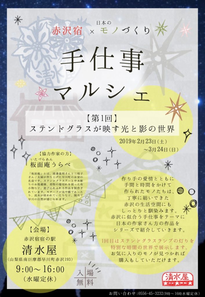 【宿の駅清水屋】イベント情報!! 2019年02月22日 ⭐️ステンドグラスが映す光と影の世界⭐️ 記念すべき第1回目!! 今回の協力作家さんは「板面庵(いたづらあん)うらべ」の浦邊さんご夫婦です。 ステンドグラスランプの灯りを特別な暗闇の世界で展示します!! 期間は2019年2月23日(土)〜2019年3月24日(日)の1ヶ月間です。 ぜひ、赤沢宿 宿の駅 清水屋 へお越しくださいませ♩♩ ・