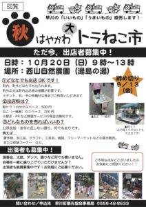 🍁秋の大トラねこ市🍁出店者・出演者大募集!! 2019年08月27日 🍁秋のはやかわ大トラねこ市🍁開催決定!! 日時:2019年10月20日(日)9時〜13時 場所:西山自然農園(湯島の湯) そして、ただいま出店者・出演者大募集!! 詳細につきましてはチラシをご覧ください♩♩ 問い合わせ先:0556-48-8633(事務局)