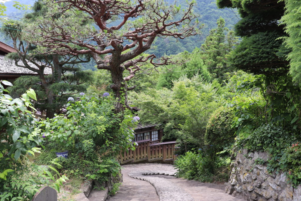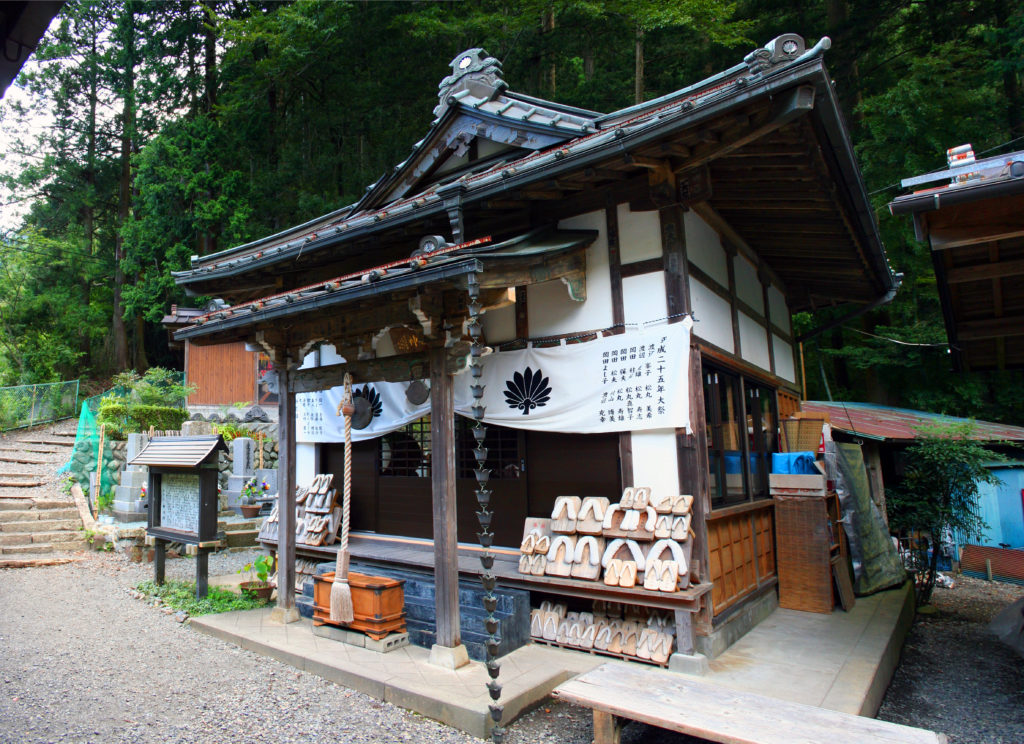 七面山登山道を約10分ほど登ります。また赤沢宿内も坂道のため、歩きやすい服装と靴でお越しください。また水筒・雨具をご持参ください。