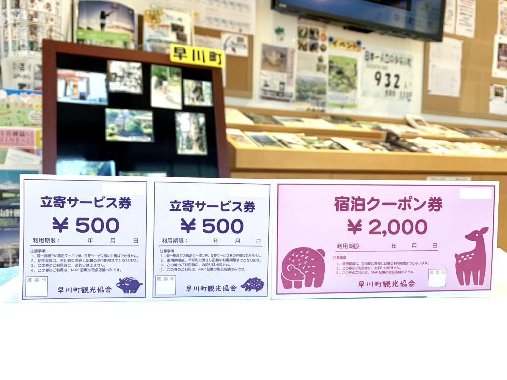早川町では7月16日 (土)より、町内加盟施設で使えるお得な割引クーポン券の配布を開始しました。内容は「2,000円割引の宿泊クーポン券」と「1,000円割引の立寄りサービス券」の2種類です。