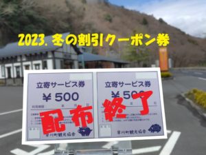 立寄サービス券の配布は終了しました! 2023年03月19日 2/18(土曜日)からお配りしていた、早川町をお得に楽しめる立寄サービス券ですが、 3/18土曜日の午後、配布が終了いたしました。 大勢の皆様にご利用していただきまして、ありがとうございました。