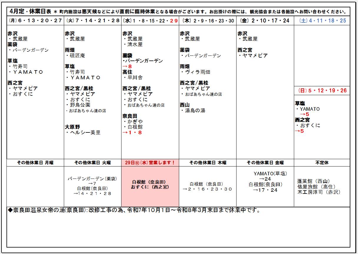 早川町観光協会員施設 4月の休日表 2026年03月30日 春本番の暖かさに誘われて、早川町の桜も次々と開花、満開となっています。早川町はヤマザクラも多数く自生しているところ。 急峻な山肌のあちこちに可憐な淡い彩りが。 この時期だけの景色を是非ともご覧ください。