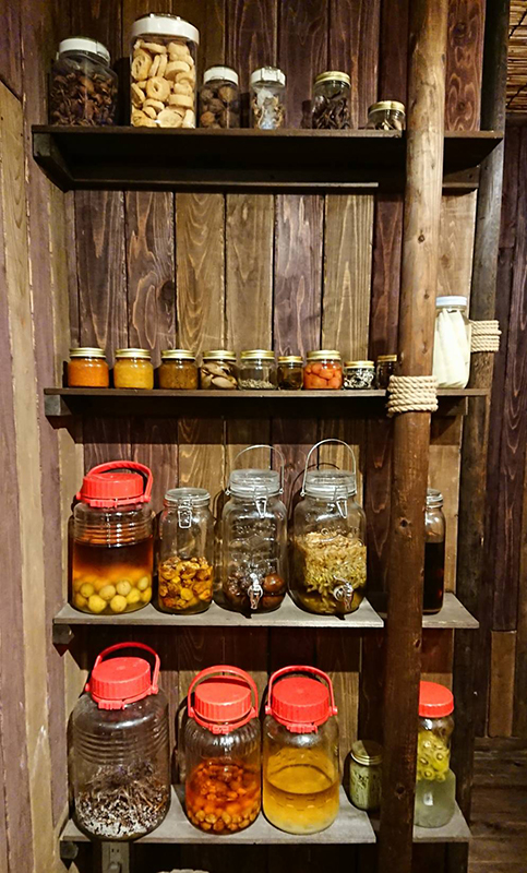 宿の看板の料理について、「お料理は私にできる、来てくれる人を幸せにしてあげられる手段なので。まだまだ勉強中ですが」と話す晴日さん。ゲストルームの入り口にお行儀良く並ぶカラフルな大小の瓶詰め達が彼女の楽しみながらも積み上げてきた日々の努力を静かに語りかけてくる様でした。この様な保存食は伝統的な奈良田の暮らしにはすこぶる普通でとても大切なものだとも教えてもらいました。宿の周辺に自生する山菜や野草採り、自生と栽培の半々ですというきのこ採りのスキルも楽しんで身に付けたもの。罠猟やその捌き方まで、楽しそうに同じく狩猟の免許を持つ健利さんと一緒に学んでいますと話します。