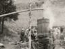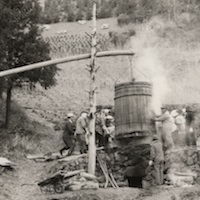早川集落の一番上地点(山に神)の脇に、味噌豆を蒸すための作業施設、釜屋がありました。今でも大きな釜が残されています。冬になると、この釜で豆を蒸しました。各家庭で一昼夜以上水に浸した大豆を、米俵、カマス、麻袋等に入れ、当日早朝にこの釜屋へ背負い込みました。水を張った鉄の大釜には丈夫な細長い棒が数本連結されており、持ち込んだ俵やカマス等をその上へ積み上げました。そして直径1.5m、高さ2mにも及ぶ巨大な吊鐘型の桶をかぶせて蒸す仕組みです。一昼夜かけ、寝ずの番で火を管理し、翌朝、各自の家へ持ち帰り味噌作りをしたものです。明治時代から始められたもので、集落内の全ての家の作業を終えるのには毎年一週間位の日数を要しました。生活様式や食生活の変化により、昭和50年代に入り、共同作業としての冬の風物詩は終わりとなりました。