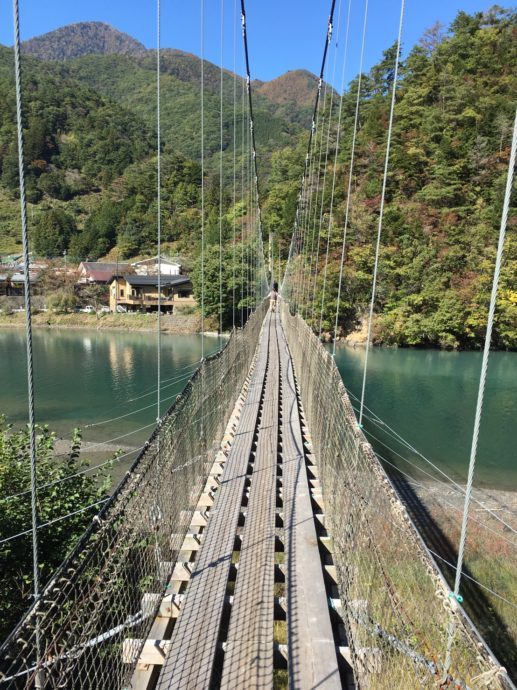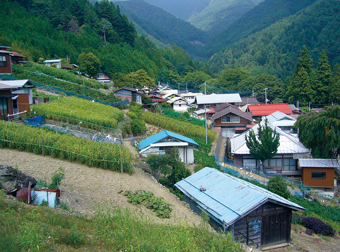 町に入り、早川左岸に見える村々が五箇地区です。早川の流れとそこにかかる橋、そして対岸にある集落とその裏の山々が一体となり、早川町の中でも農村的な風景を見ることができます。五箇地区では、昭和の後半まで養蚕が盛んに行われていました。それらを象徴する畑や民家の兜作りの大きい屋根、そして石積みや用水路跡等、農業に関する文化的資源が多数残ります。現在では、町の特産品でもある山ぶどうワイン「恋紫」の原料となるぶどうが生産され、ぶどう畑を多数見ることができます。