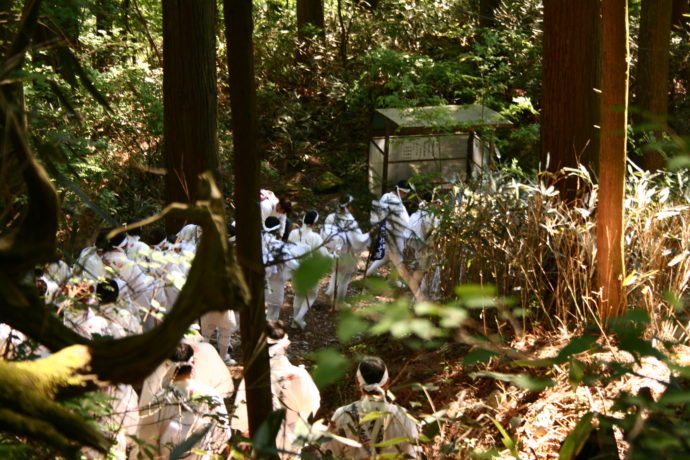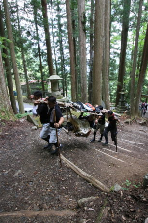 七面山表参道登山口の羽衣集落には、徳川家康公の側室お萬の方が、七面山の女人禁制を解くために身を清めた「白糸の滝」があります。その上流には「雄滝」もあり、今でも滝に打たれる信者さんの姿が見られます。また、参詣客を向かい入れる宿坊や旅館も建ち並び、登山口から10分ほど登った神力坊には、お萬の方が七面山参詣の際にお使いになられたとされるお駕籠の棒が残されています。