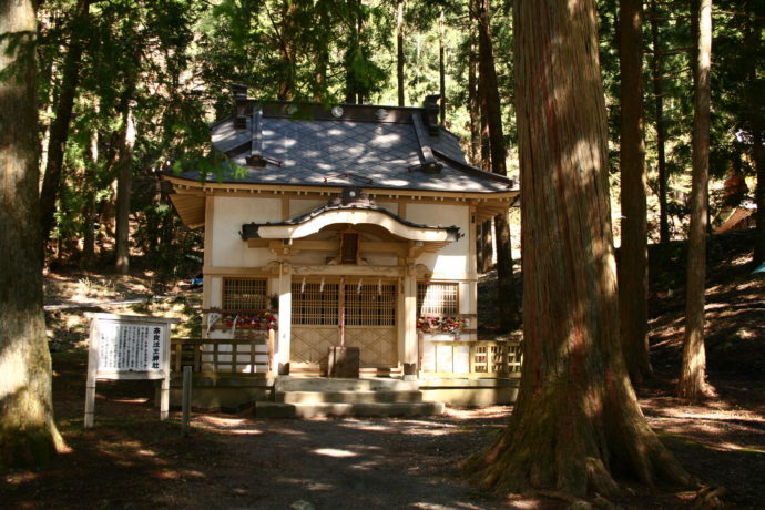 八幡日吉神社の境内にある樹齢800年の夫婦杉は、山梨県の天然記念物に指定されています。太さ約7m、高さ約40mという、巨木2本が寄添うように立っているのは珍しく、モモンガが生息しており、運が良ければ出会えます。