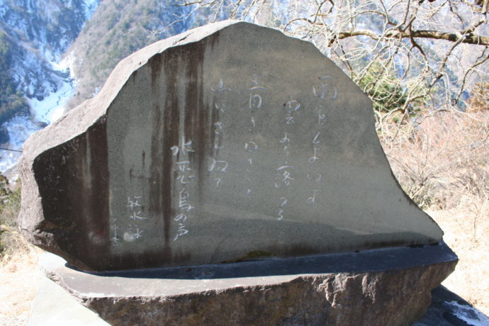 江戸屋旅館前、大阪屋下、赤沢石畳最上部と、赤沢宿内3か所に若山牧水の歌碑がある。牧水は大正13年に友人と七面山へ向かう道中、赤沢に宿泊。その旅の中で31首の歌を詠んでいます。(七面山表参道登山口に、もう1つ歌碑があります)