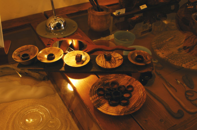 現在のギャラリー内には、ガラスの装身具や器、早川で育った木による動植物のエネルギーをテーマにした作品の他、器類や皿なども多く並びます。それらは、私達が此処で暮らし、癒されたり、感動したりする様々な『何か』を、『形』にしたものです。